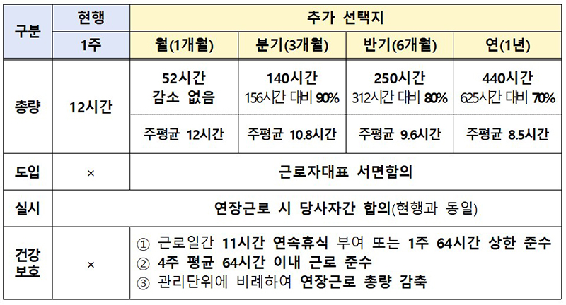 정부가 연장근로 시간 선택권을 확대해 현행 1주 외에 월, 분기, 반기, 연 단위로 연장근로를 운영할 수 있도록 추가적인 선택지를 부여한다.