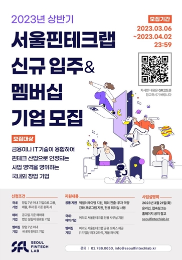 입주를 희망하는 창업기업은 기간 내 서울핀테크랩 누리집, 소셜미디어의 '공지사항'을 통해 온라인으로 접수하면 된다.