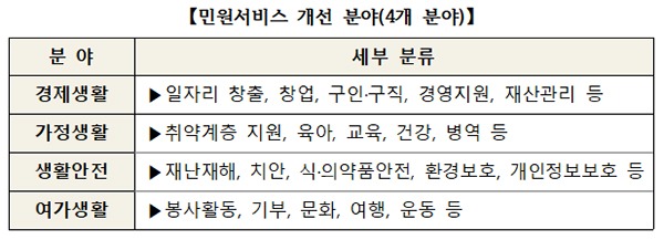 공모 분야는 경제생활, 가정생활, 생활안전, 여가생활 등 4개 분야로 국민의 일상 전반을 아우르는 생활 밀접 민원서비스가 포함된다.