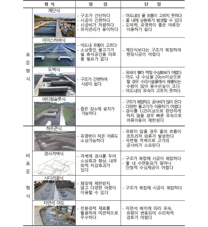 현재 도벽식·계단식·아이스하버식·버터컬슬롯식 등 4개에 불과한 표준형식을 어도의 형태와 생태 특성별로 효과성·이용성이 우수한 형식으로 다양화한다.