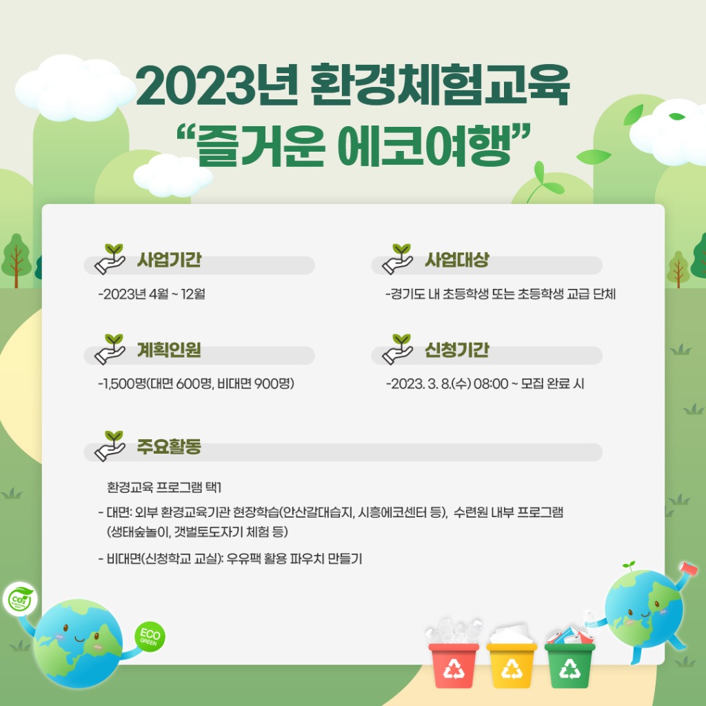 경기도청소년수련원이 지역 체험 중심 환경교육 프로그램 ‘즐거운 에코여행’ 참가 단체를 모집한다.