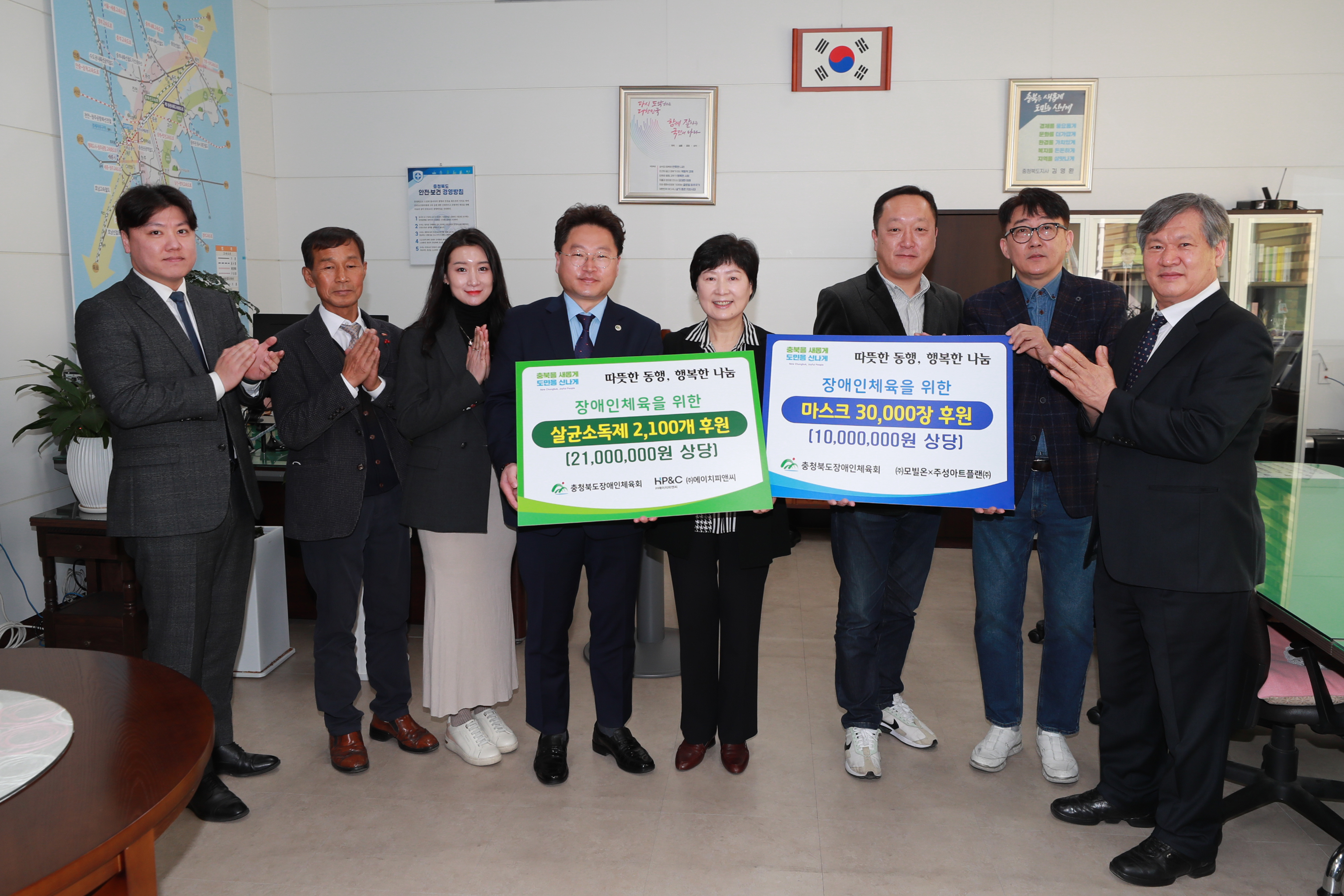 후원한 소독제와 마스크는 충청북도 시·군장애인체육회, 장애인 체육 가맹단체 및 체육단체 등 50여 개소에 전달될 예정이다.