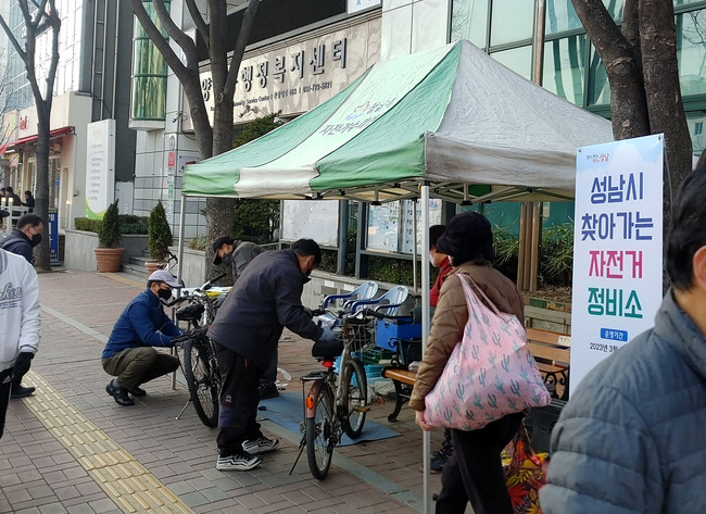 ▲ 성남시 양지동 행정복지센터 앞에 3월 6일 설치 운영된 이동식 자전거 정비소 © 비전성남