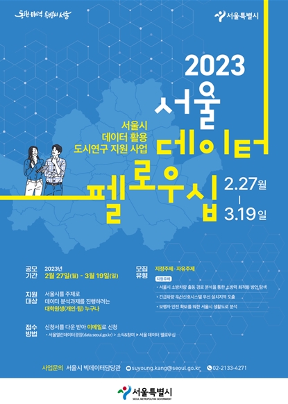 서울시는 2월 27일부터 2023년 '서울 데이터 펠로우십'(이하 ‘펠로우십’) 공모를 진행 중이다.