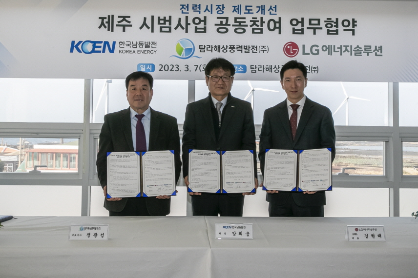 7일 AVEL은 제주시 한경면에 위치한 탐라해상풍력발전 본사에서 한국남동발전 강희웅 신재생에너지처장, 탐라해상풍력발전 정광성 대표, AVEL 김현태 대표 등이 참석한 가운데 ‘전력시장 제도개선 제주 시범사업 공동 참여를 위한 업무협약’을 체결했다고 밝혔다.