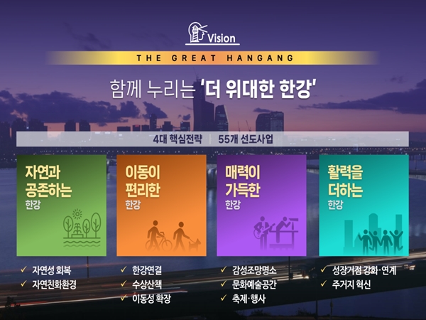 '그레이트 한강 프로젝트'는 이전 한강르네상스사업(2007)의 2.0 버전으로서, “함께 누리는 더 위대한 한강”을 비전으로 4대 핵심전략, 55개 사업을 추진한다. 4대 핵심전략은 자연과 공존하는 한강, 이동이 편리한 한강, 매력이 가득한 한강, 활력을 더하는 한강이다.