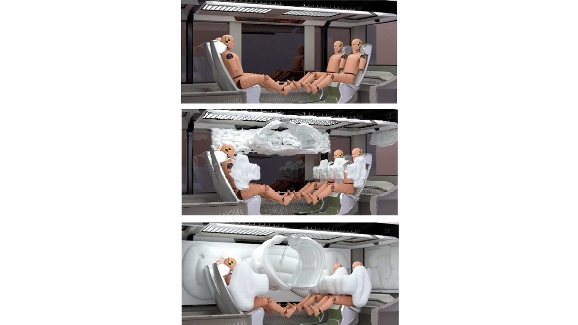 먼저‘대면착좌 에어백’이 차량 천정 중앙에서 터져 마주보는 승객의 충돌을 방지한다. 창문과 지붕의 연결부 네 곳에선 ‘커튼 에어백’이 이름 그대로 실내 사방을 커버하며 쏟아져 내린다. 이에 더해 좌석 시트 뒷면 좌우에서 작동하는 ‘전방위 에어백’은 탐승객의 몸을 감싸는 일종의 보호막 역할을 해준다.