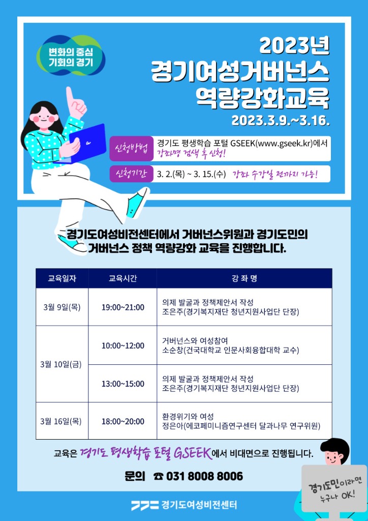 경기도여성비전센터가 9일과 10일, 16일 3일간 경기도평생학습포털 지식(GSEEK)에서 ‘경기여성거버넌스 역량강화교육’를 연다.