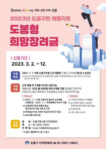 지원 대상은 2023년 1월 1일 이후 도봉구민을 정규직으로 신규 채용한 도봉구 소재 소기업·소상공인이며, 신청은 근로자 채용 후 3개월 근무가 지난 뒤 가능하다.