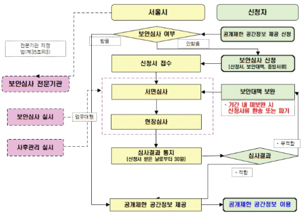 민간기업이 서울시에 보안심사를 신청하면 보안심사 전문기관이 기업의 보안관리체계를 전문적으로 점검하고, 신청일로부터 30일 이내에 심사결과 통지 및 공간정보 제공 등의 절차가 이루어진다.