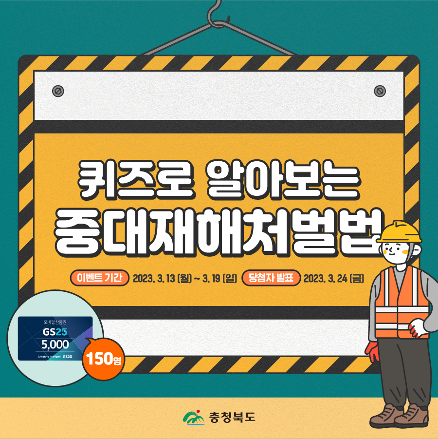 충북도는 중대재해처벌법 시행 2년차 중대재해 예방의 중요성을 일깨우고, 국민안전의 날(4월 16일)을 맞아 안전문화 조성을 위해 도민을 대상으로‘SNS 초성 퀴즈이벤트’를 3월 13일부터 19일까지 실시한다.