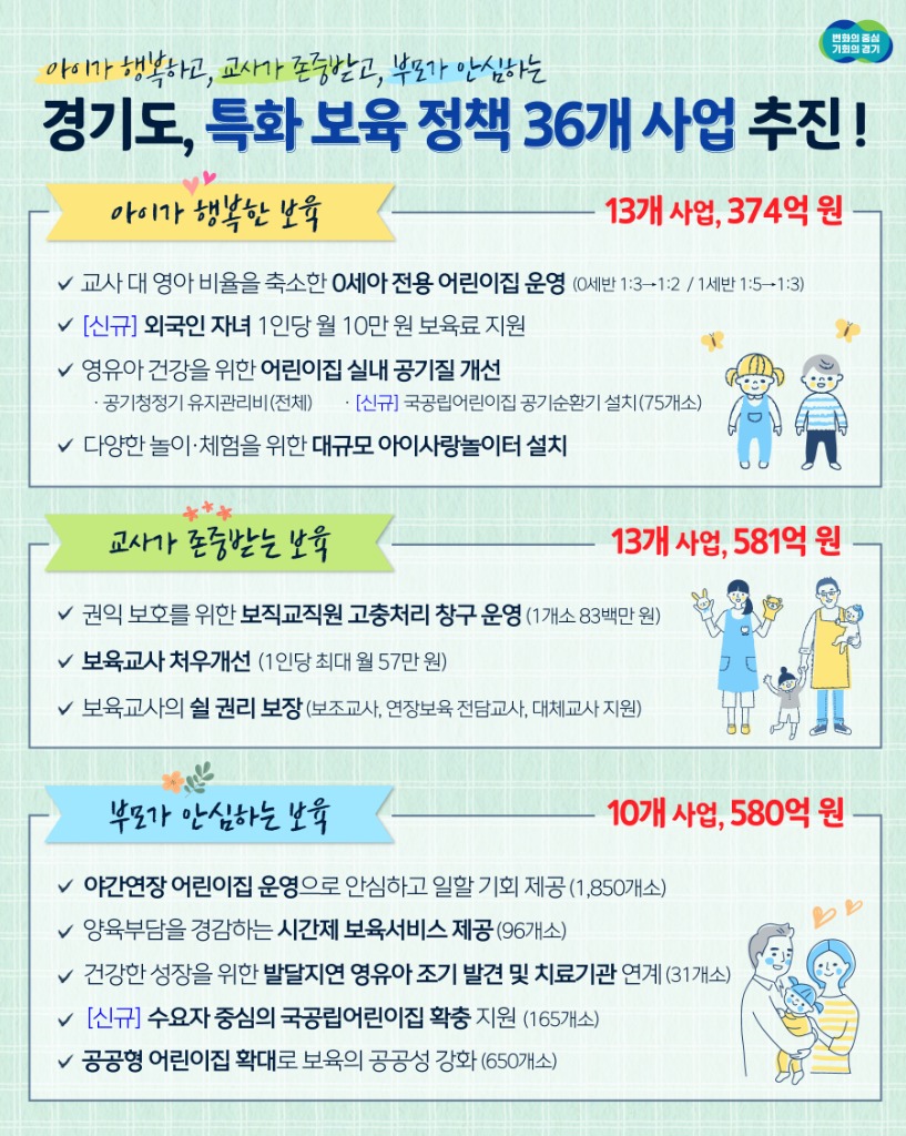 경기도가 보육의 세 축인 아이·교사·부모 모두가 행복한 보육환경 조성을 위해 올해 0세아 전용어린이집 확대, 교직원 고충 처리 창구 운영, 야간연장어린이집 운영 등 36개 경기도 특화 보육 정책 사업에 도비 1천535억 원을 투입한다.