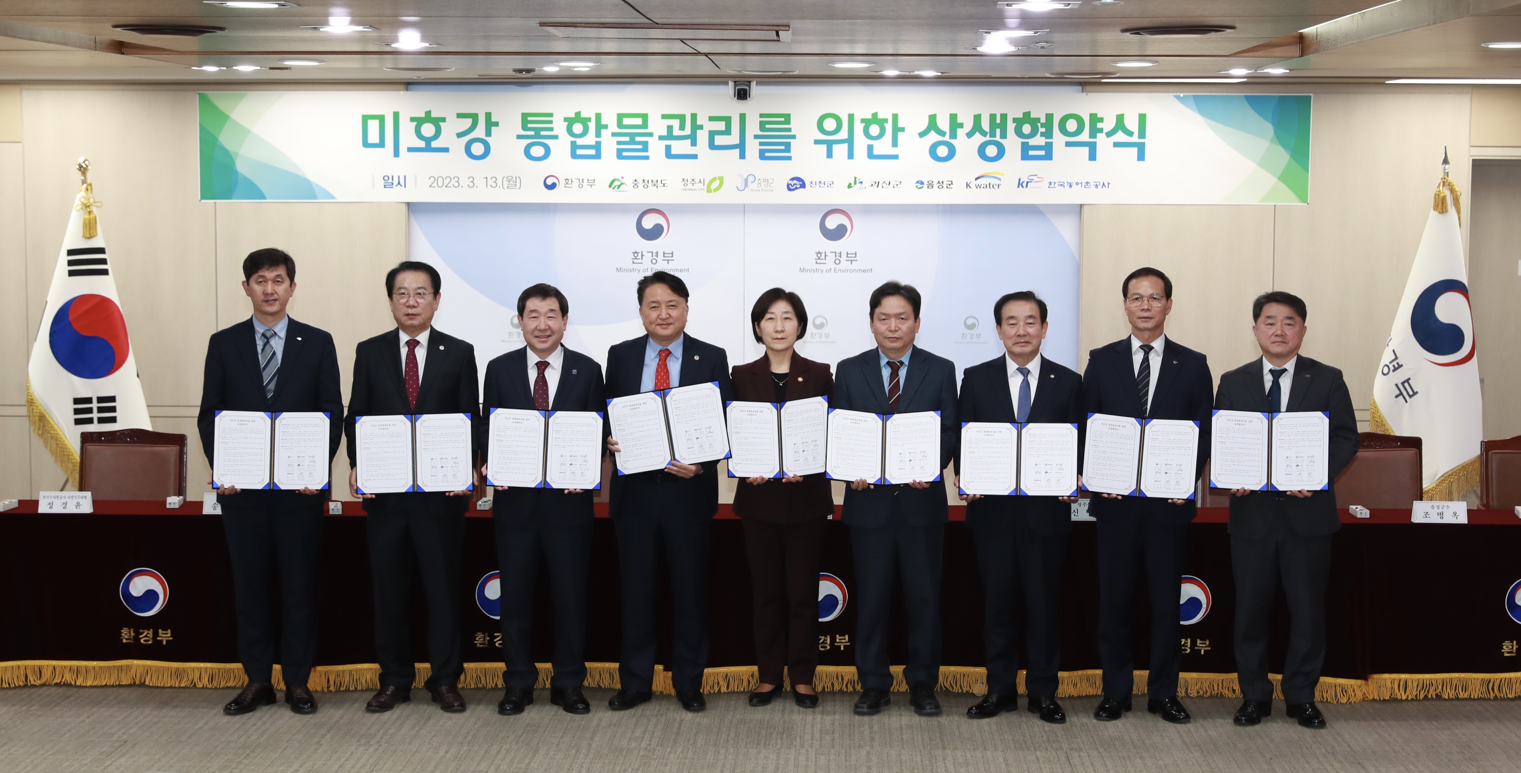 충북도는 3월 13일 오전 환경부 등 8개 관계기관*과 환경부 회의실에서 ‘미호강 통합물관리를 위한 상생협약’을 체결했다고 밝혔다.