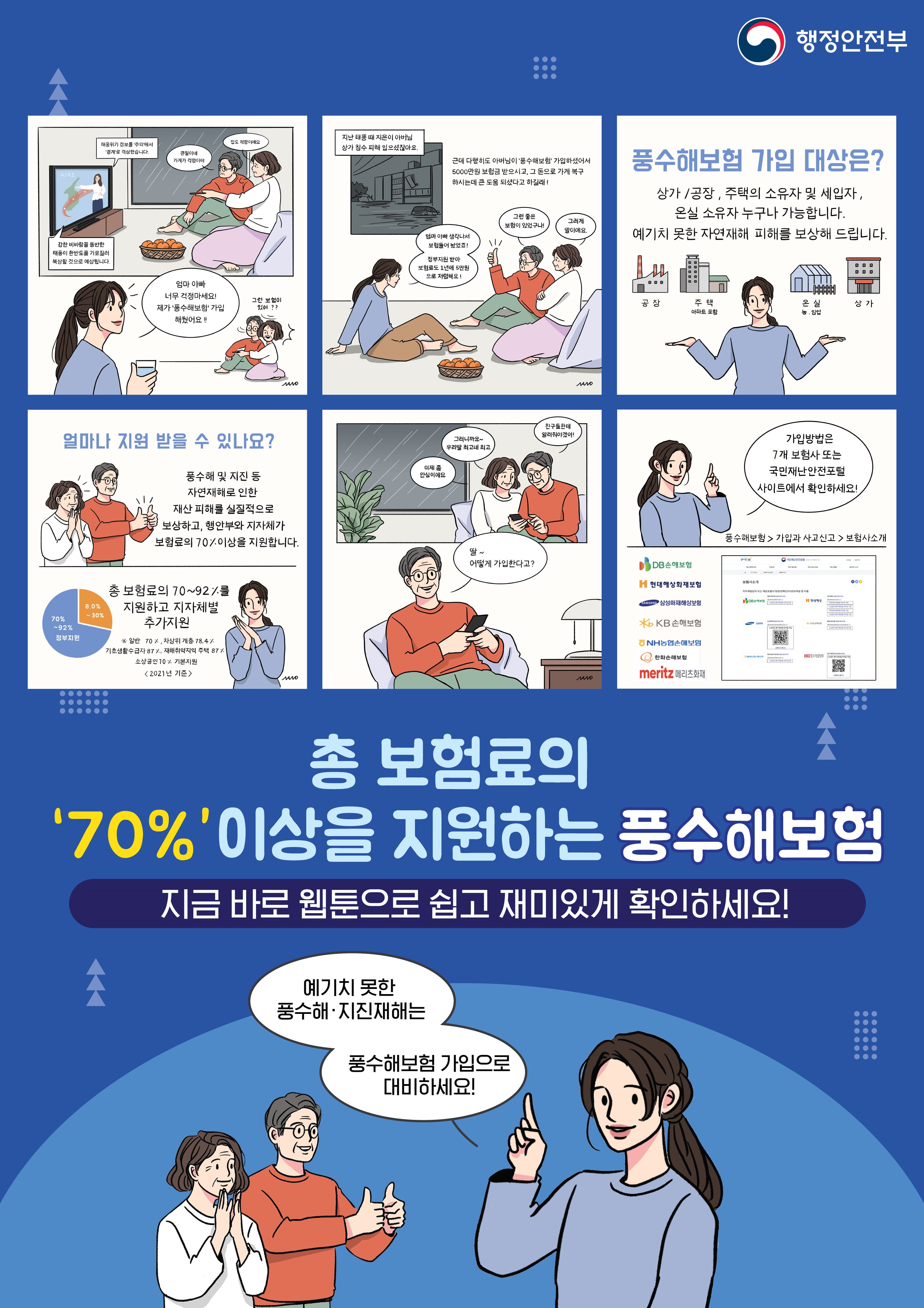 대상 재해는 △태풍 △홍수 △호우 △강풍 △풍랑 △해일 △대설 △지진이며, 보험료의 지원범위는 70~92%로 저소득층은 기부금을 활용하여 무료가입이 가능하다.