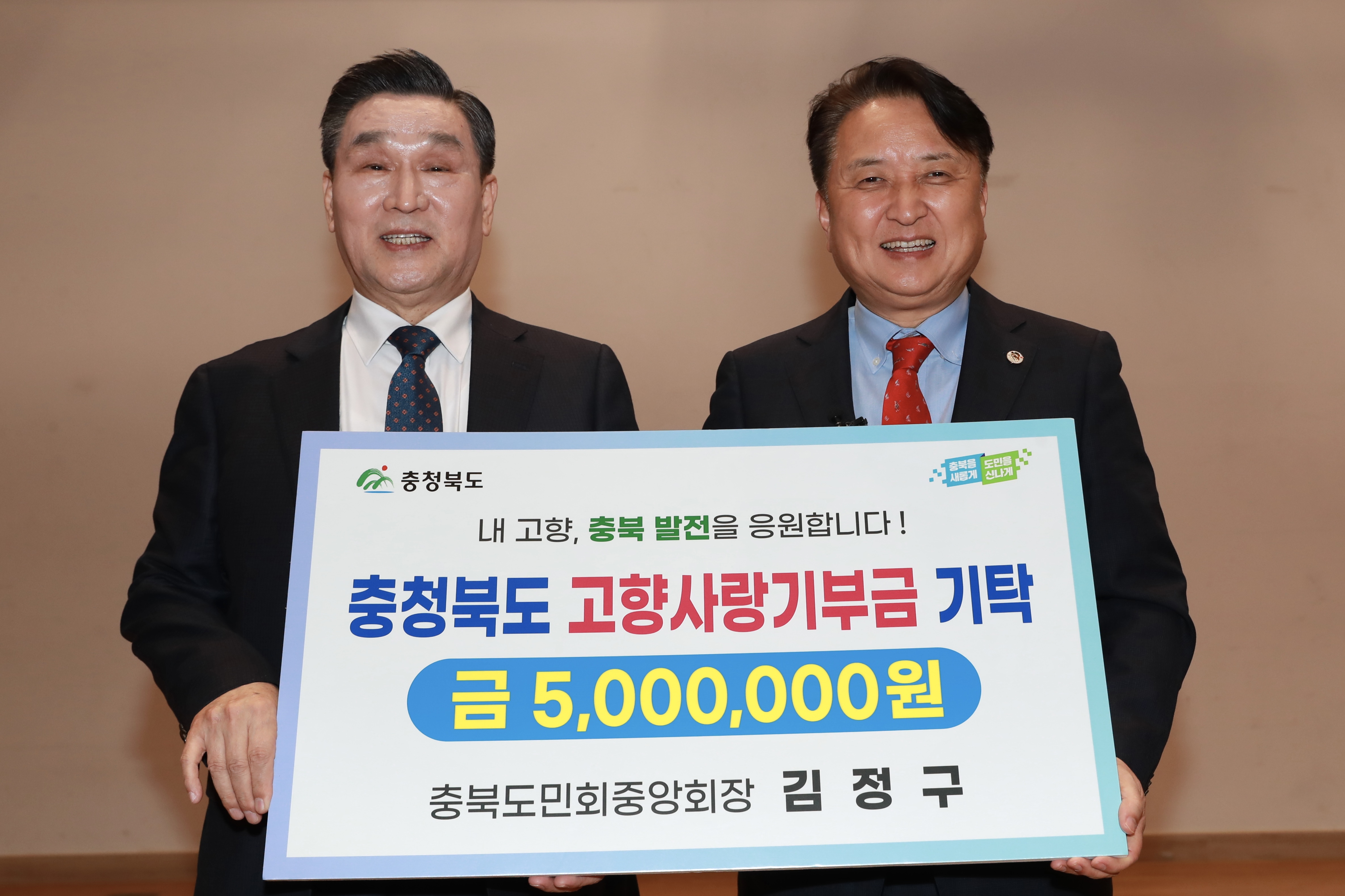 충북도민회 중앙회 김정구 회장이 고향인 충청북도에 기부한도 최고액 500만원을 기탁했다.