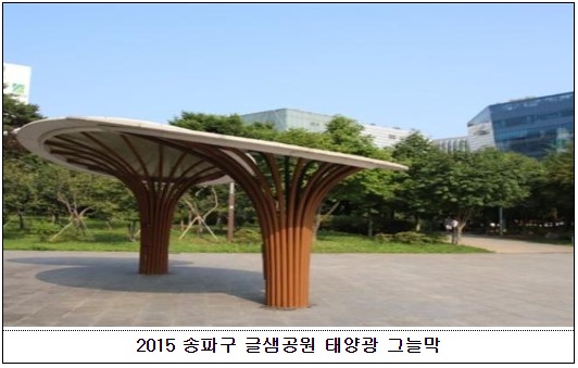 자치구 디자인 태양광 특화사업은 자치구별 지역 특색에 맞는 다양한 형태의 디자인 태양광 보급을 위해 서울시가 ‘15년부터 추진한 사업으로, ’19년 4개 지역(광진·마포·구로·관악구)에 공원 태양광 쉼터 등을 조성했다.