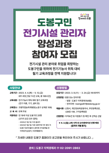 서울 도봉구가 전기시설 관리 분야로 취업을 희망하는 구민들을 위해 전기기능사 자격증 취득 대비 교육과정(필기시험)을 운영한다고 밝혔다.