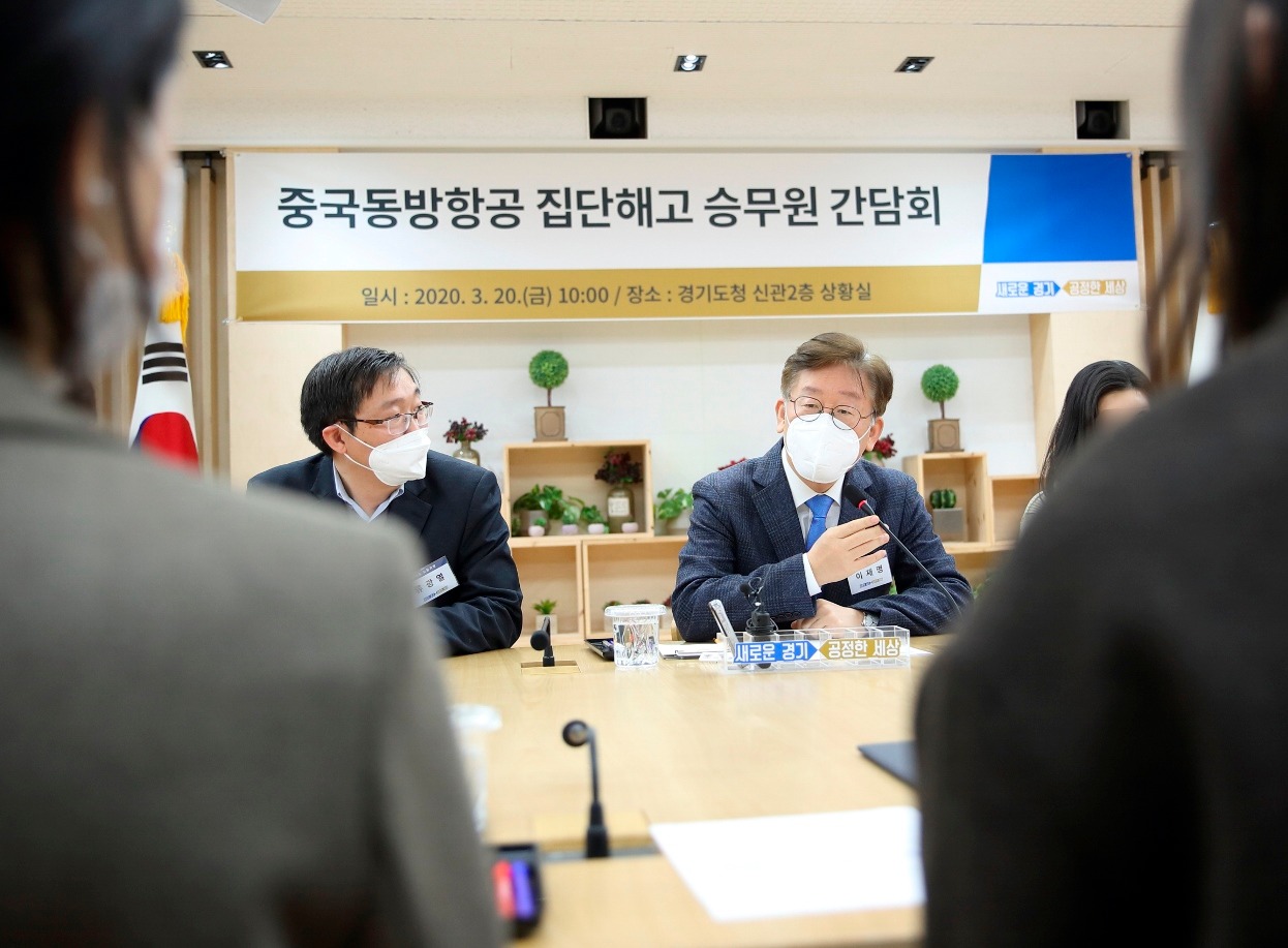 이재명 지사는 20일 오전 경기도청 상황실에서 중국동방항공 집단해고 승무원 및 법률대리인 20여명과 간담회를 갖고, 이 같은 뜻을 밝혔다.