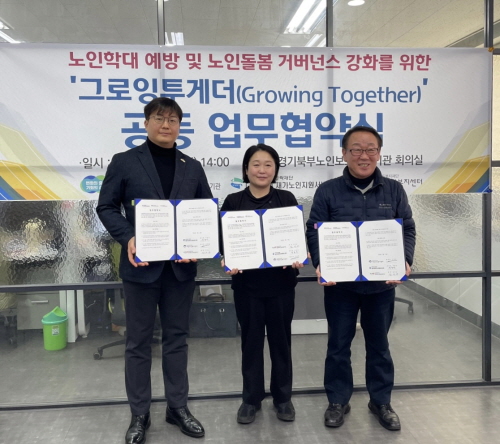 경기도사회서비스원 경기북부노인보호전문기관이 지난 13일 오후 나눔의 샘 재가노인지원서비스센터, 시민노인복지센터와 노인학대 예방과 노인돌봄 거버넌스 강화를 위한 그로잉 투게더(Growing Together) 공동 업무협약을 체결했다.