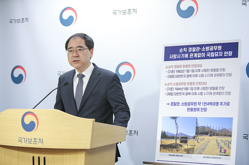 보훈처는 윤석열 정부의 국정과제인 ’국가와 국민을 위해 희생한 분을 존중하고 기억하는 나라’ 구현의 일환으로 순직 경찰관과 소방공무원을 빠짐없이 예우하고자 국립묘지법 개정안 통과를 적극 추진했다.