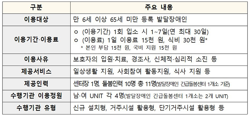 발달장애인 긴급돌봄 시범사업 주요 내용(장애인거주시설 운영기관의 경우, 신규 설치형으로도 참여 가능) 발달장애인 긴급돌봄 시범사업은 발달장애인 보호자의 입원, 경조사, 신체적·심리적 소진 등 긴급한 상황이 발생하는 경우 발달장애인 및 보호자에게 일시적으로 24시간 긴급돌봄서비스를 제공한다.