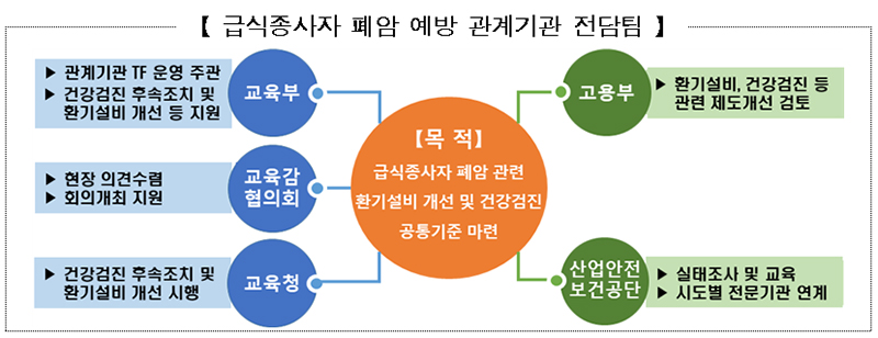 이와 함께 조리실 환기설비 개선 방안 등을 논의하고자 고용부, 전국시도교육감협의회, 시도교육청, 안전보건공단과 함께 ‘학교 급식종사자 폐암 예방 관계기관 전담팀(TF)’을 운영한다.