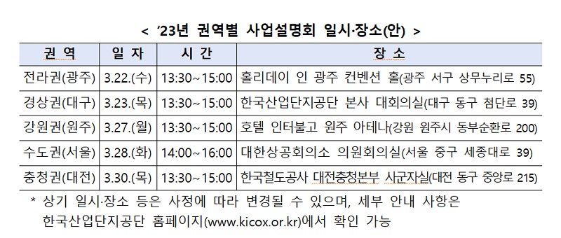 산업부와 한국산업단지공단은 오는 22일부터 광주를 시작으로 권역별 사업설명회를 개최해 사업안내서를 배포하고 지원 내용에 대해 상세하게 설명할 예정이다.