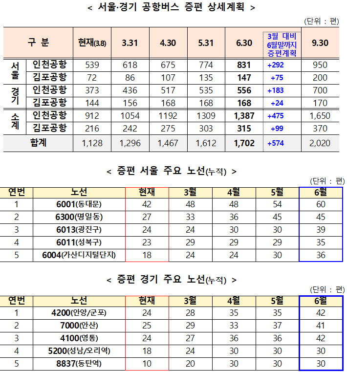 국토교통부는 서울시, 경기도, 인천국제공항공사, 한국공항공사 등과 협의해 서울·경기권 공항버스를 6월 말까지 574편, 9월 말까지 892편을 각각 증편하기로 했다고 15일 밝혔다.