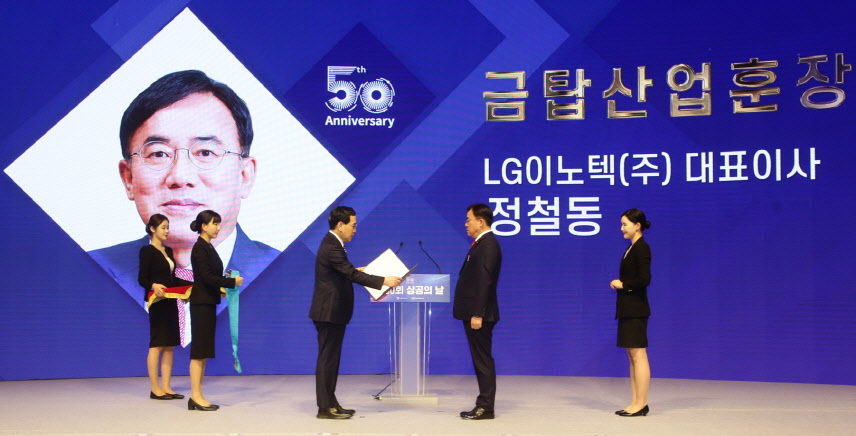 정철동 LG이노텍 사장이 15일 대한상공회의소)가 개최한 ‘제50회 상공의 날’ 기념식에서 최고 영예인 금탑산업훈장을 수상했다.