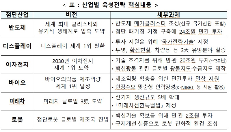 국내 기업들은 2026년까지 반도체, 디스플레이, 이차전지, 바이오, 미래차, 로봇 등 우리가 강점을 보유한 첨단 분야 6대 핵심 산업에 550조원을 투자한다. 정부도 투자, 인력, 기술, 생태계 등 종합적인 육성 전략을 통해 글로벌 선도국 도약을 적극 지원한다. 반도체는 세계 최대 클러스터와 유기적 생태계로 압축 도약을 위해 반도체 메가클러스터를 조성하고 첨단 패키징 거점 구축에 24조원 민간 투자를 진행한다.