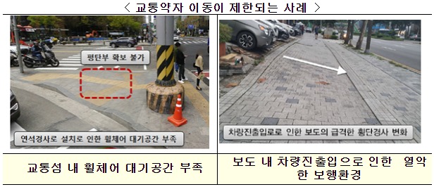 교통약자가 도로에서 휠체어를 원활하게 이용하도록 교통섬 내 대기공간과 보도 내 차량 진출입 경사 등 세부기준을 마련하여 교통약자와 함께 모든 사람이 도로를 안전하고 편리하게 이용할 수 있도록 도로설계 방향을 제시할 예정이다.