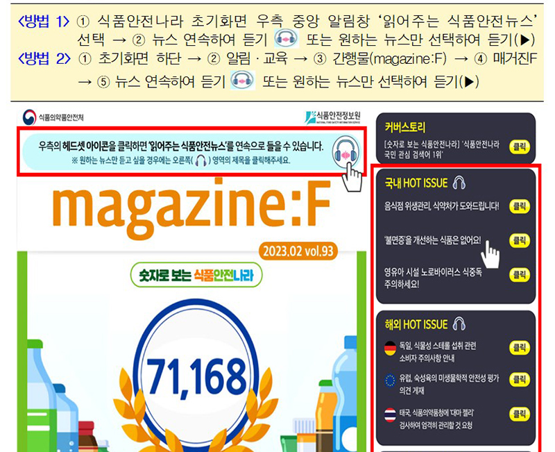 올해는 식품안전나라 월간지인 ‘매거진F’에서 ‘국내·외 핫이슈’와 계절별 식품 안전정보 등 ‘이달의 식재료 이야기’를 달마다 선정해 음성으로 정보를 읽어주는 서비스를 시범적으로 제공한다.