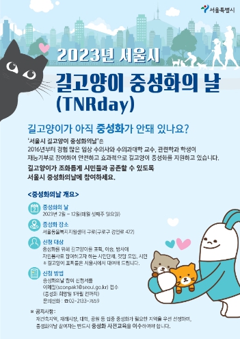 서울시는 길고양이 개체수를 효율적으로 조절하고 건전한 돌봄 문화 확산을 위해 '서울시 길고양이 중성화의날(TNRday)'을 구로에 위치한 서울시 동물복지지원센터 내 중성화수술센터에서 매월 셋째주 일요일에 정기적으로 개최한다.