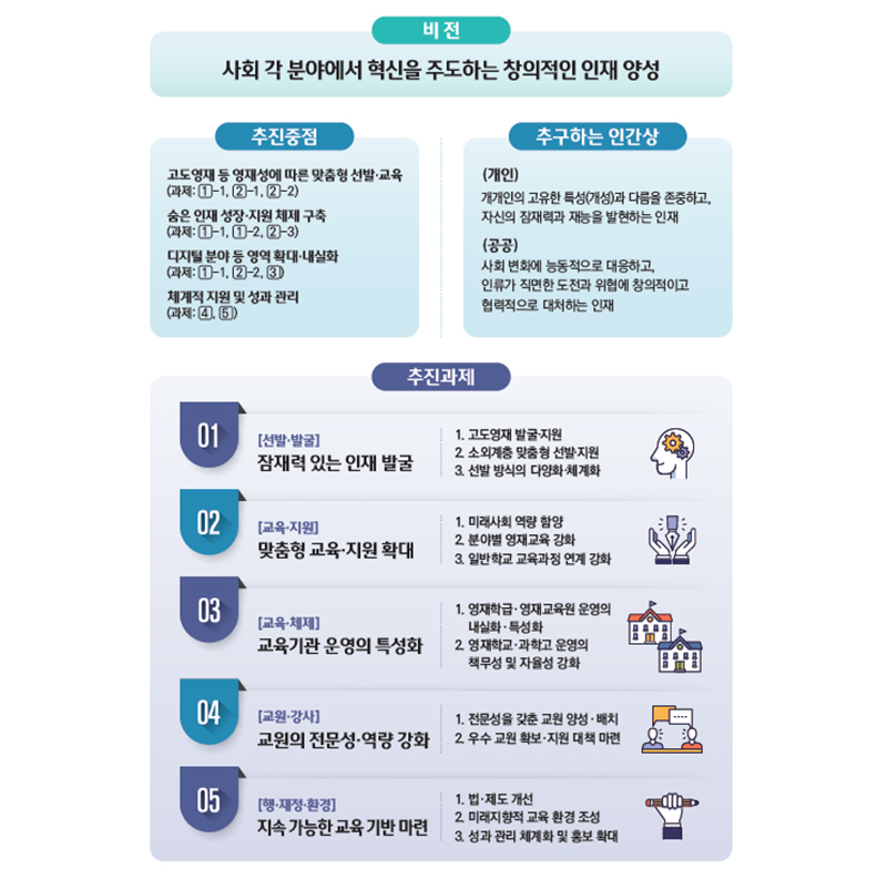 정부가 숨은 인재 발굴과 개별 학생 특성에 따른 영재교육 맞춤형 지원을 강화하고 영재교육기관의 내실화와 성과 관리를 실시한다.