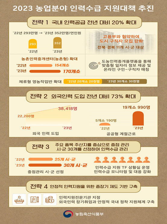 우선 농식품부는 국내인력 공급 확대를 위해 농촌인력중개센터를 154곳에서 올해 170곳으로 확대한다.