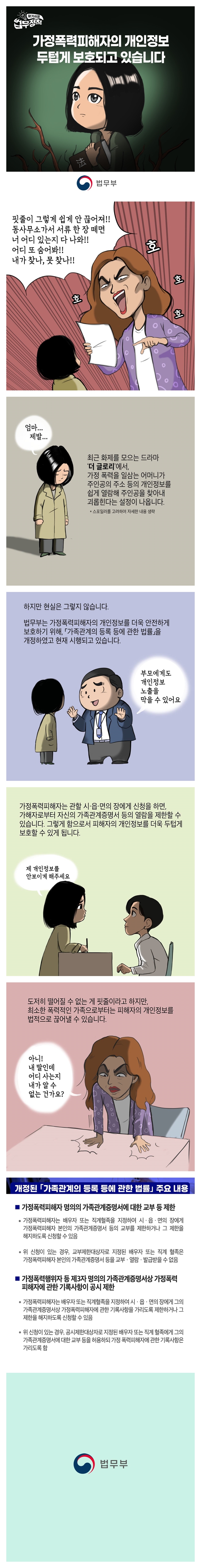 ▶ 법무부는 가정폭력피해자의 개인정보 등을 더욱 안전하게 보호하기 위해, ‘가족관계의 등록 등에 관한 법률’을 개정하였고 현재 시행되고 있습니다.
