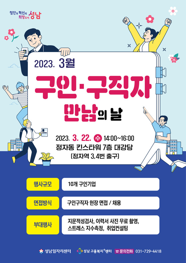 성남시는 오는 3월 22일 분당구 정자동 킨스타워 7층 대강당에서 올해 첫 ‘구인·구직자 만남의 날’ 행사를 연다.