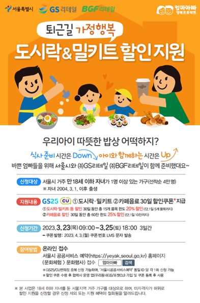 서울시는 CU편의점의 참여로 더욱 풍성해진 ‘퇴근길 가정행복 도시락‧밀키트 할인지원’ 4월분 신청을 3월 23일 오전 9시부터 서울시 공공서비스예약시스템을 통해 선착순으로 받는다고 밝혔다. 지원대상은 서울거주 만 18세 이하 자녀가 있는 가구다.