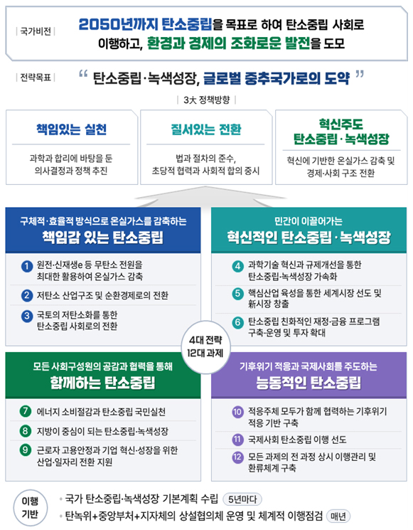 이는 지난해 새로 시행된 탄소중립기본법에 따라 처음 수립한 정부 차원의 탄소중립·녹색성장 관련 최상위 법정 계획으로 정부의 탄소중립 이행 및 녹색성장 추진 의지와 정책 방향이 담겨 있는 청사진이다.