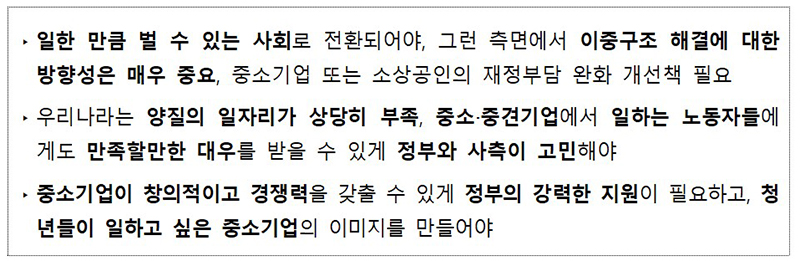 제도개편 필요성에 공감하면서도 공짜야근, 임금체불, 장시간 근로 관행, 연차 사용의 어려움 등을 해소해야 실질적으로 지지와 공감을 받을 수 있다는 의견이 많았다.