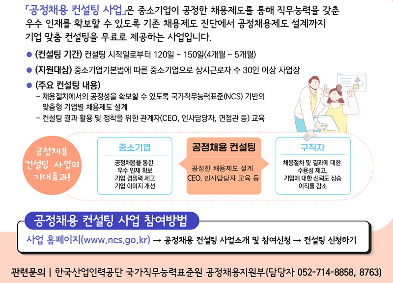 고용노동부와 한국산업인력공단은 21일 ‘공정채용 컨설팅’ 사업을 신규 시행한다고 밝혔다. 이에 참여를 희망하는 중소기업은 사업 홈페이지( https://www.ncs.go.kr )에 접속해 원하는 컨설팅 기관을 선택하고 신청하면 된다.