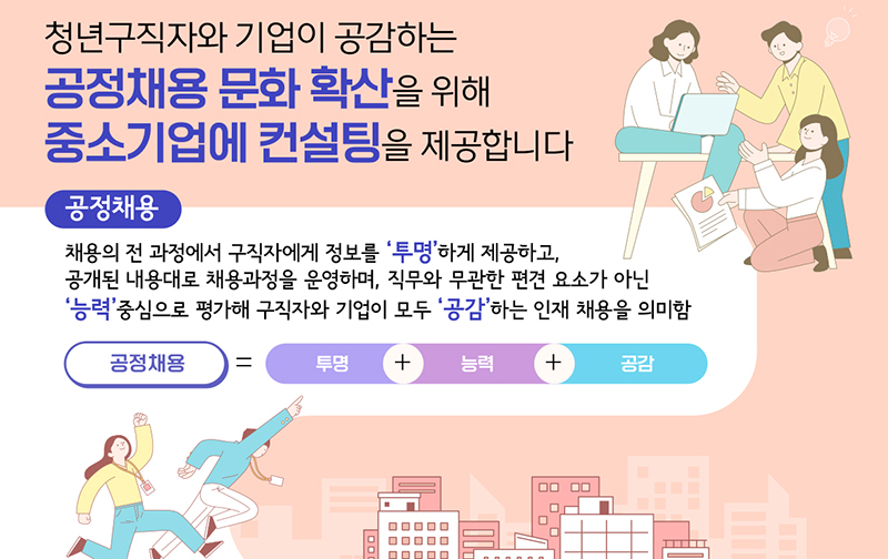 신청은 21일부터 가능하며, 신청한 기업에는 ▲현 채용제도 진단 ▲청년·기업이 공감하는 공정채용제도 설계 ▲우수사례 등을 제공한다.