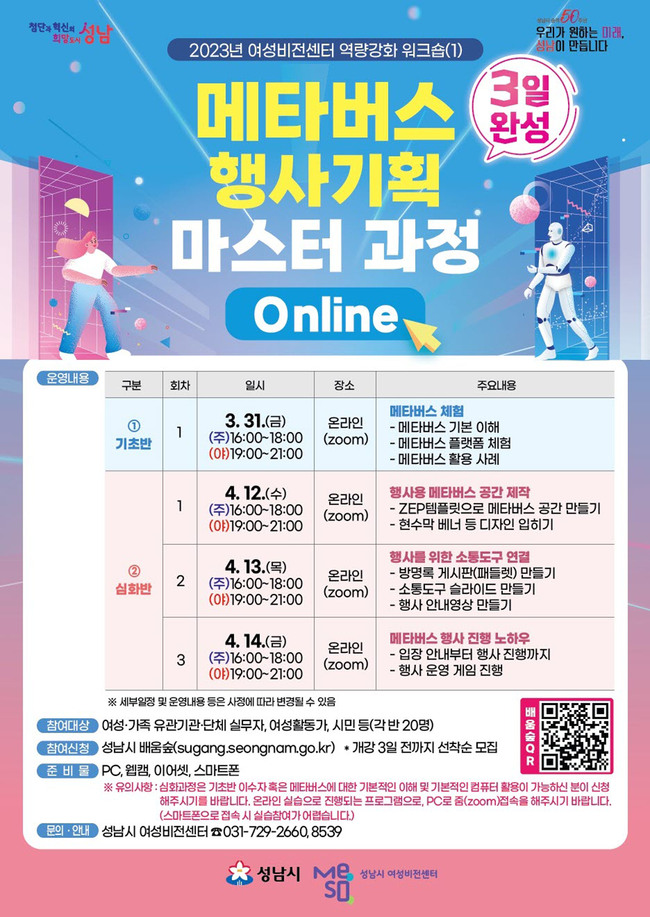 성남시는 오는 3월 28일까지 ‘메타버스(확장 가상 세계) 행사기획 마스터 과정’ 온라인 교육생 총 80명을 모집한다.