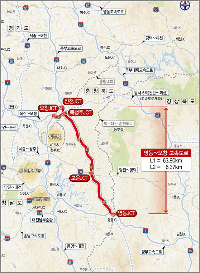 영동~오창 고속도로는 영동군 용산면 영동JCT에서 청주시 청원구 오창JCT까지 63.9㎞ 구간(남북6축)과 오창JCT에서 청주국제공항IC를 포함한 6.37㎞ 구간(동서5축)을 신설하는 사업이다.