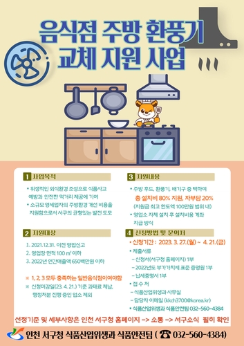 인천 서구가 위생적인 외식환경을 조성하고 안전한 먹거리를 제공하기 위해 음식점 주방 환풍기 교체를 지원한다고 23일 밝혔다.