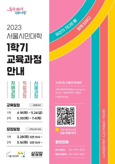 서울시민대학 1학기 교육과정은 오는 28일 오전 10시부터 서울시평생학습포털에서 선착순으로 접수한다. 수강신청과 관련한 보다 자세한 내용은 서울시평생교육진흥원 누리집 또는 서울시평생학습포털을 통해 확인할 수 있다.