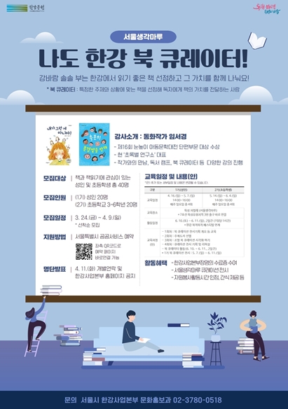모집 기간은 3월 24일부터 4월 9일까지 이며 서울특별시 공공서비스 예약 누리집에서 ‘북 큐레이터’를 검색 후 접수하면 된다. 보다 자세한 사항은 한강사업본부 누리집을 통해 확인할 수 있다.