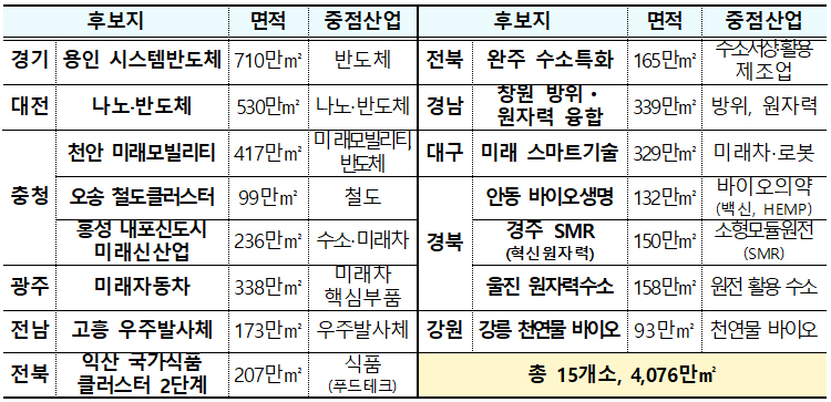 앞서 정부는 지난 15일 열린 ‘제14차 비상경제민생회의’에서 미래 첨단산업 육성을 위해 전국에 15개 ‘국가첨단산업단지(산단)’를 조성한다고 밝힌 바 있다.