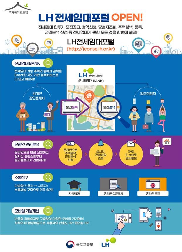LH는 전세임대 고객들의 주택물색을 지원하고 입주과정 온라인 원스톱 처리와 전세임대 관련 종합정보를 제공하는 ‘전세임대포털 서비스’를 26일(목)부터 시행한다고 밝혔다.