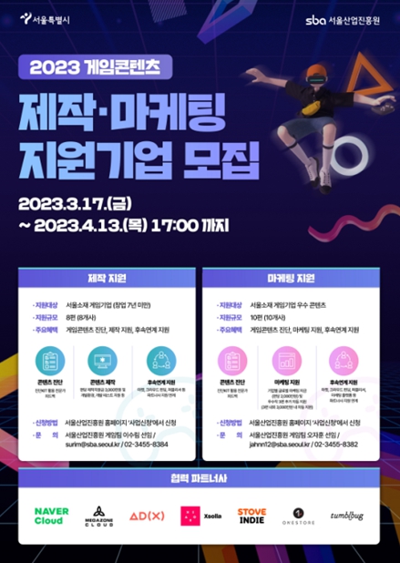 서울시와 서울산업진흥원은 우수한 게임 콘텐츠 제작 기업을 발굴하고 글로벌 진출을 지원하는 ‘2023 서울시 우수 게임콘텐츠 제작/마케팅 지원사업’ 참여기업을 4월 13일까지 모집한다고 밝혔다.